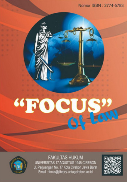 FOCUS: Journal of Law adalah jurnal media komunikasi dan publikasi ilmiah yang diterbitkan dua kali setahun oleh Fakultas Hukum, Universitas 17 Agustus 1945 Cirebon, yang menerima artikel hasil penelitian di bidang hukum termasuk: Teori Hukum, Hukum Perdata, Hukum Administrasi, Hukum Indonesia, Filsafat Hukum, Hukum Administrasi Negara, Hukum Pidana, Hukum Internasional, Hukum Agama, Filsafat Hukum dan lain-lain.